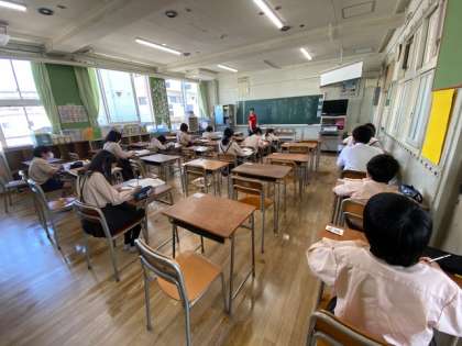 写真は、1組の教室(前半グループの国語)と多目的室(後半グループの理科)のようすです。