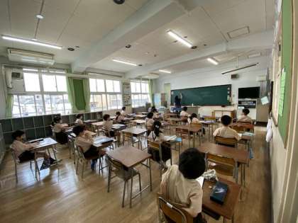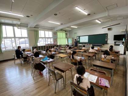 写真は、2年生1・2組の前半グループの授業のようすです。