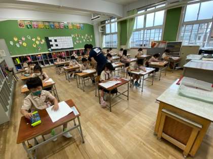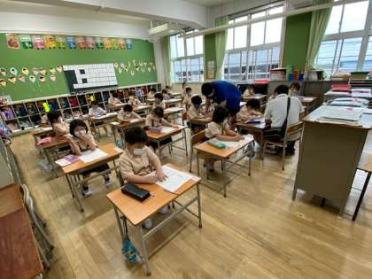 1年生1・2組の授業のようすです。算数の授業で、初めてテストをしています。