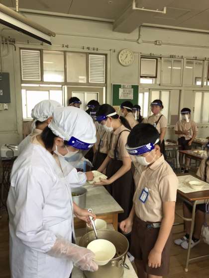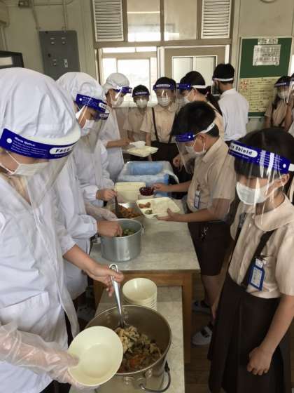 6年1組の配膳のようすです。当番を中心として、フェイスシールドをつけています。