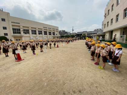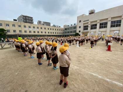 2年生から6年生が整列したところへ1年生が入場してきました。1年生の学年主任から1年生の紹介をしてもらってから、お互いに「よろしくお願いします」と声を掛け合いました。