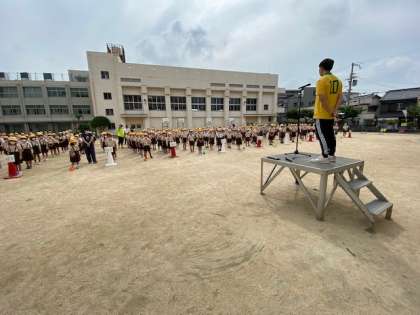 対面式の後、1年生から6年生まで全員がそろった初めての児童朝会が行われました。