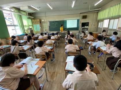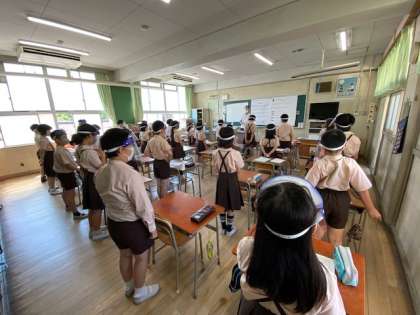 4年生1・2組の授業のようすです。社会と音楽の授業です。音楽はフェイスシールドをつけて歌っています。