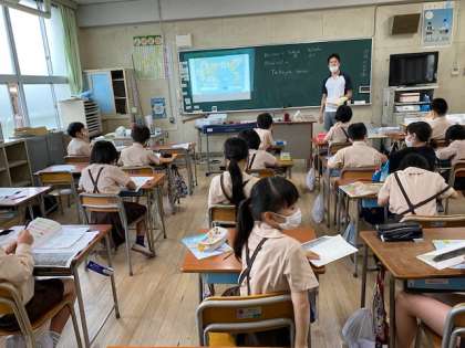 4年生1・2組の授業のようすです。1組は社会で大阪についての学習、2組は英語活動です。
