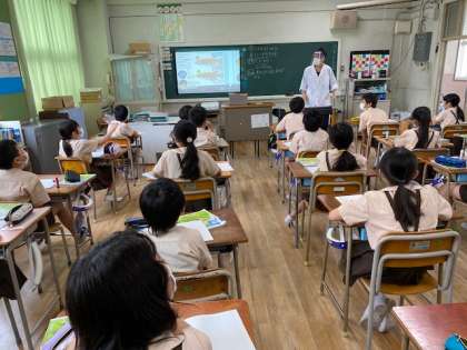 5年生1・2組の授業のようすです。1組は理科でメダカの学習、2組は社会であたたかい土地の暮らしの学習です。