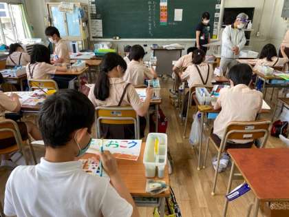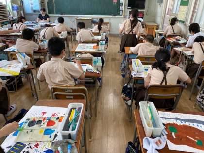 6年生1・2組の授業のようすです。どちらも図工の授業です。防災ポスターを仕上げています。