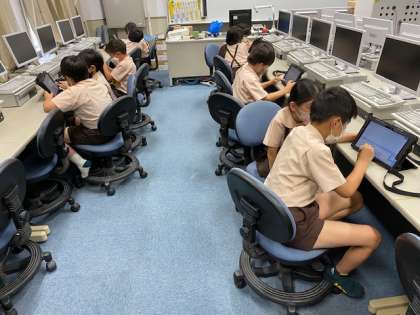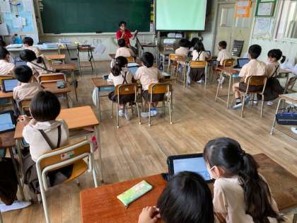 3年生1・2組の授業のようすです。どちらも国語の授業で、リポートを書くための準備でタブレットを使っています。