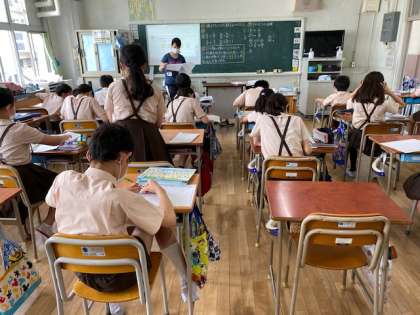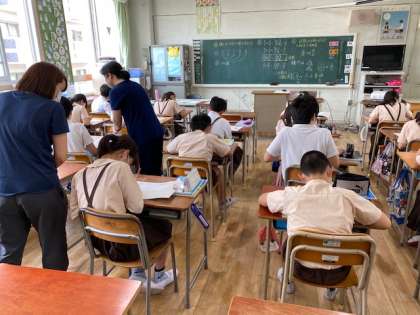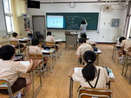 6年生は、算数の授業で、2クラスをを3つのコースに分けて、習熟度別の授業を行っています。1組・2組の教室と図工室に分かれています。逆数(ある数字に掛けて1になる数字)の学習をしています。