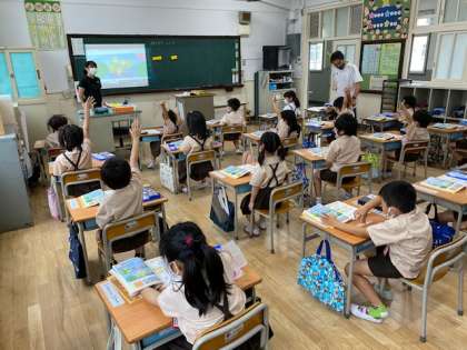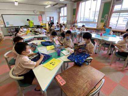 1年生1・2組の授業のようすです。1組は、図書の時間で図書館で本を借りて読んでいます。2組は算数ブロックを使って足し算の学習です。