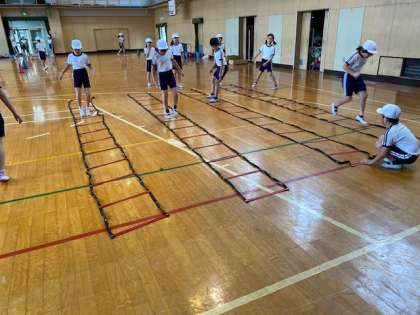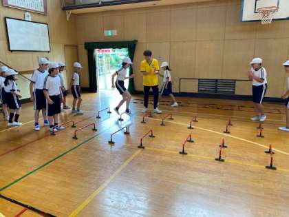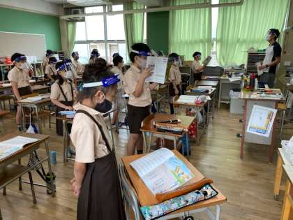 4年生1・2組の授業のようすです。1組は、体育の授業で、体育館で足を動かす運動を行っています。2組は、音楽の授業で、フェイスシールドを着けて歌を歌っています。