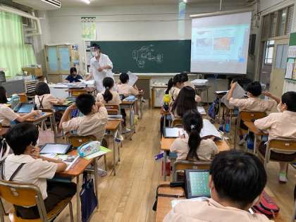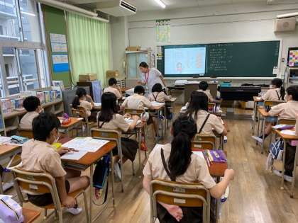 5年生1・2組の授業のようすです。1組は体育で、教室で保健の授業です。2組は理科で、生物の授業です。