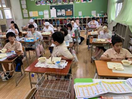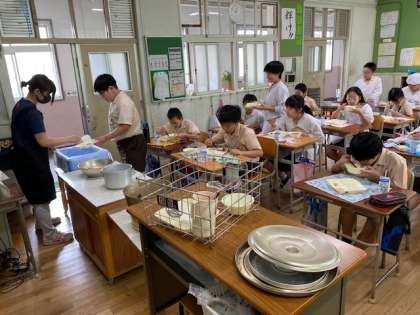 5年2組の給食のようすです。お代わりする人が並んで、担任の先生に入れてもらっています。