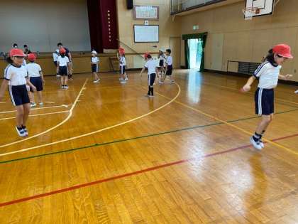 4年生1・2組の授業のようすです。1組は社会で、資源ゴミについて学習しています。2組は体育で、なわとびの練習をしています。