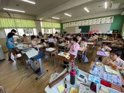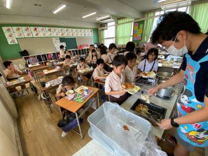 4年2組の給食のようすです。お代わりに並んで先生に入れてもらっています。