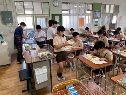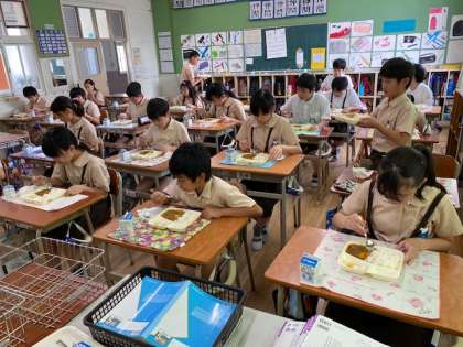 6年2組の給食のようすです。静かにお行儀よく食べています。お代わりをする人が先生に入れてもらっています。