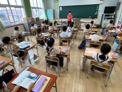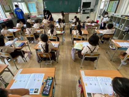 本日3時間目、1年生1・2組の授業のようすです。どちらも国語で、かたかなの学習等をしています。