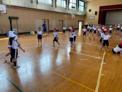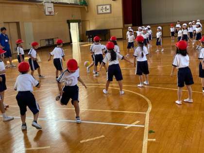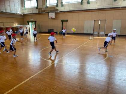 本日2時間目、1年生1・2組の授業の合同体育のようすです。ドッジボールをしています。ボールを投げても相手になかなか届かないので、当てられて外野に行く人がとても少ないです。