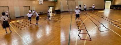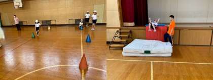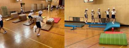 本日2時間目、4年生1組の体育の授業のようすです。様々な運動を班ごとに時間で区切って体験していきます。