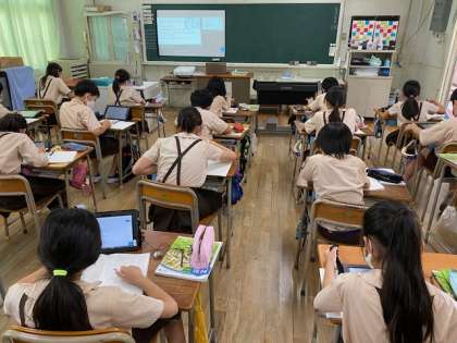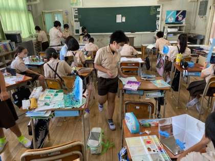 本日2時間目、5年生1・2組の授業のようすです。1組は理科でタブレットを使って、台風について調べ学習をしています。2組は昨日の1組と同じ鏡を使った作品作りをしています。できた人から自習をしています。