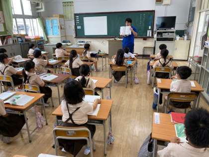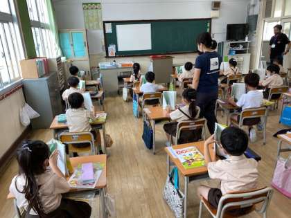 本日2時間目、1年生1・2組の授業のようすです。どちらも国語で、「おおきなかぶ」をみんなで一緒に音読したりしています。