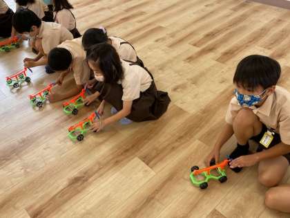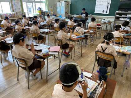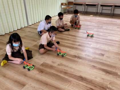 本日2時間目、3年生1・2組の授業のようすです。1組は音楽で、フェイスシールドを着けてリコーダーを吹く練習をしています。2組は理科で、ゴムの動力でプロペラを回して動く車を作って走らせています。