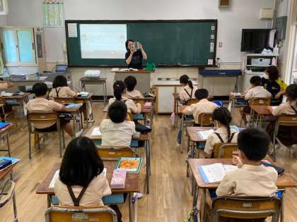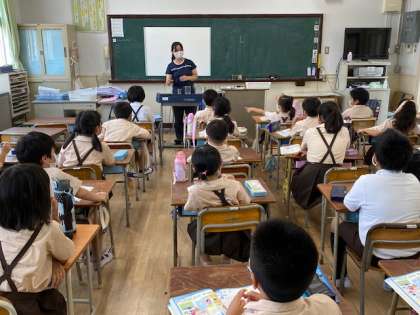 本日2時間目、2年生1・2組の授業のようすです。どちらも算数で、様々な容器を使って1リットルの「かさ」について学習しています。