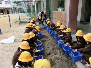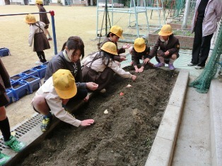 1年生では12月15日にチューリップの球根を植えました。子どもたちは植木鉢に土を入れ、穴を掘って、丁寧に球根を植えていきます。