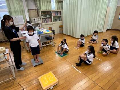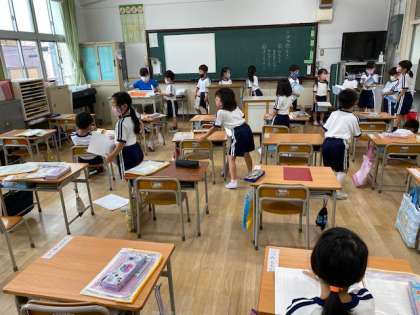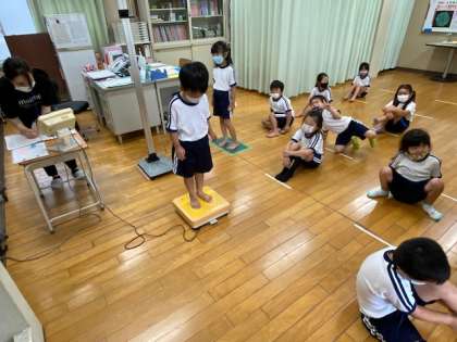 本日2時間目、1年生1・2組のようすです。1組は保健室で発育測定をしています。2組は1組が終わるまで教室で学活をして、提出物の点検をしています。