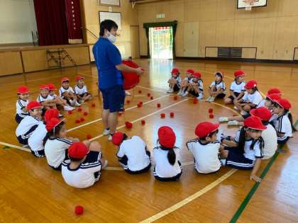 本日2時間目、1年生1・2組の合同体育のようすです。運動会に向けて、玉入れの練習等をしました。