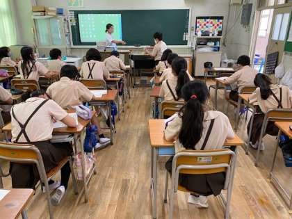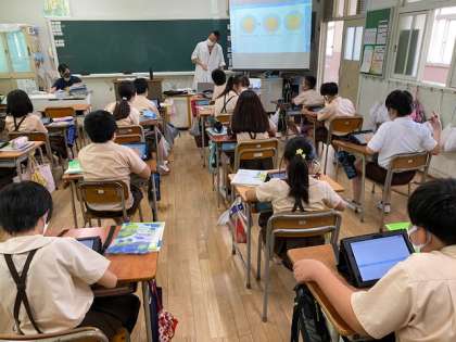 本日2時間目、5年生1・2組の授業のようすです。1組は総合で、敬老の手紙を書いています。2組は理科で、花について学習したことをタブレットを使ってグループで交流をしています。