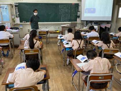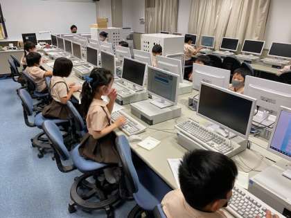 本日2時間目、3年生1・2組の授業のようすです。1組は総合で、パソコン室でゲーム形式のキーボード操作の訓練ソフトに取り組んでいます。2組は国語で「サーカスのライオン」の学習をしています。