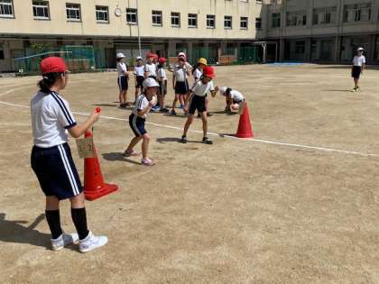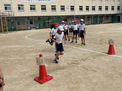 本日2時間目、5年生1・2組の授業のようすです。1組は体育で、2人1組で運動場のトラックを1周するタイムを計測しています。2組は理科でプリント学習をしています。