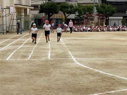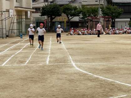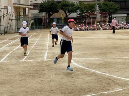 本日2時間目、4年生1・2組の合同体育のようすです。トラックを半周走ってタイムを計っています。