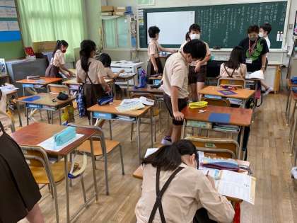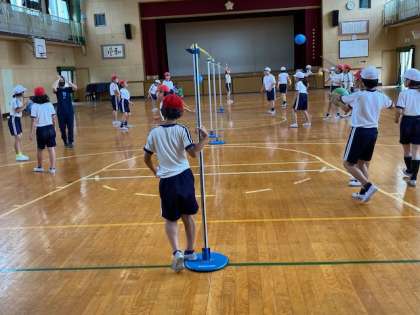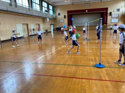 本日3時間目、5年生1・2組の授業のようすです。1組は道徳で、和太鼓を取りあげた教材で文化や伝統のよさについて考えて道徳ノートに書きこんで提出しています。2組は体育で、ソフトバレーボールに取り組んでいます。