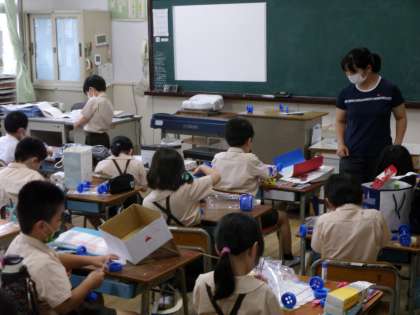 2年生の学習の様子です。生活科の学習で、身近な材料(ペットボトル、ティッシュの箱など)を使って動くおもちゃを作るところです。