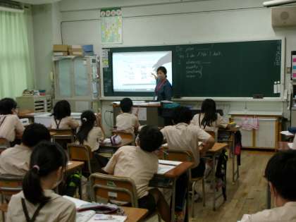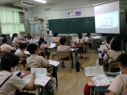 5年生の学習の様子です。今日は英語で「what time do you get up ?」(何時に起きましたか)を学習しました。そこから「what time 〜 ?」(何時に〜しましたか)を使って会話の練習をしました。