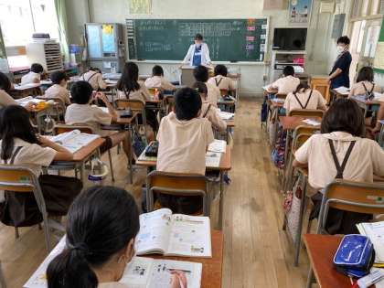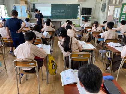 本日2時間目、6年生1・2組の授業のようすです。どちらも算数で、「表を使って考えよう」というテーマで1個1mの木の柵11個を2辺に使って囲まれる面積が最大になる条件を考えています。
