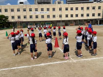 本日3時間目、1年生1・2組の合同体育のようすです。運動場で、玉入れの入場等の練習をしています。