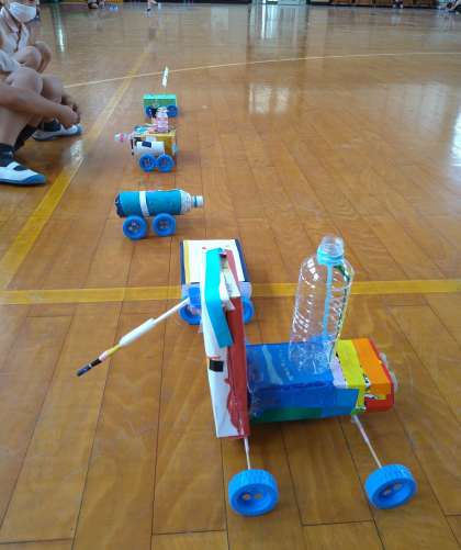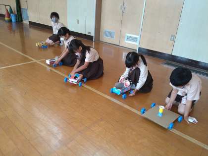 生活科の「うごくうごくわたしのおもちゃ」の学習で、身近にあるペットボトルや牛乳パック等を使って、工夫をしながらうごく車をつくりました。