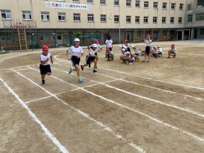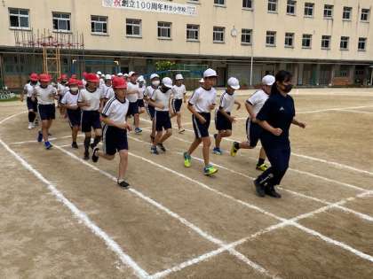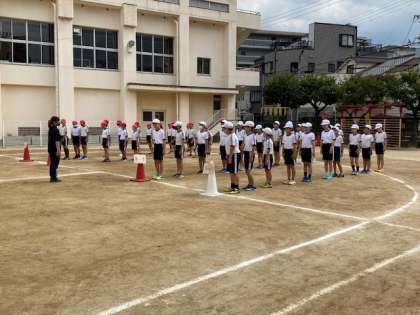 EX体操等をした後、個人走の入場から退場までの流れと学年競技の入場から退場までの練習をしました。