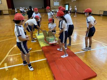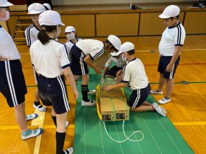 EX体操の後、学年競技のそりに荷物をどう載せたら落ちにくいかを赤・白それぞれ工夫していました。