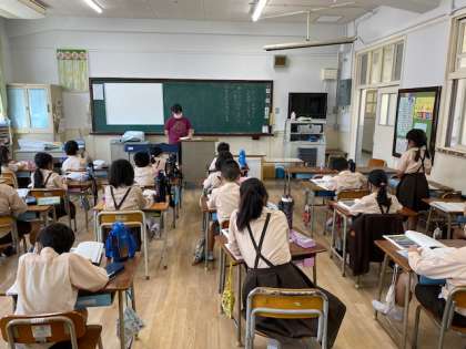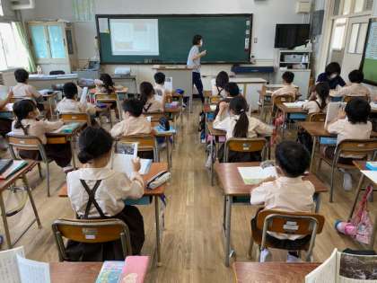 本日3時間目、2年生1・2組の授業のようすです。どちらも国語で、「ビーバーの大工事」をみんなで音読したりしています。