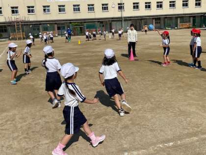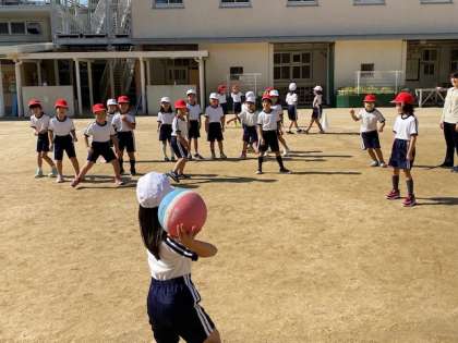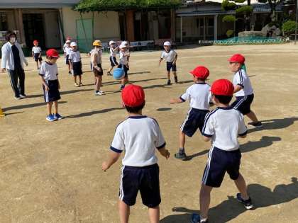 本日2時間目、1年生1・2組の授業のようすです。合同体育で整列の練習をした後、ドッジボールをしています。