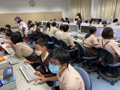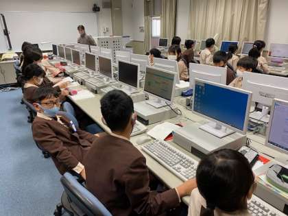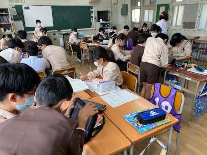 本日2時間目、6年生1・2組の授業のようすです。どちらも国語で、「町の幸福論」で野里の未来をどうするかについて、班ごとにパソコン室や教室で相談してまとめています。