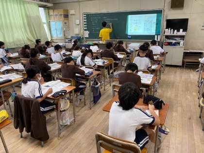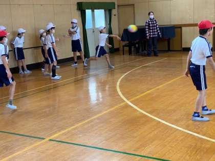 本日2時間目、4年生1・2組の授業のようすです。1組は社会で、「防災マニュアルをつくろう」というテーマに取り組んでいます。2組は体育で、ボールを2個使ったドッジボールをしています。