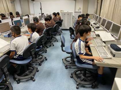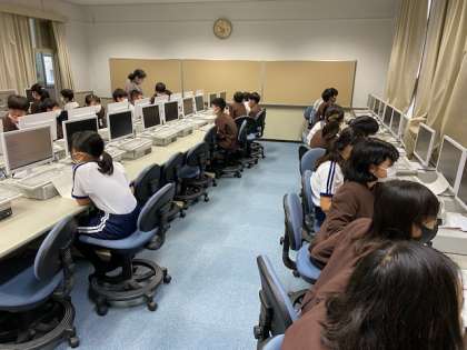 本日2時間目、6年生1・2組の授業のようすです。どちらも国語で、昨日に引き続き「町の幸福論」で野里の未来をどうするかについて、班ごとにパソコン室や教室で相談してまとめています。