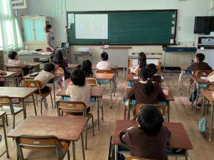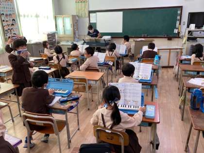本日5時間目、2年生1・2組の授業のようすです。1組は学活で、NHKのなわとびの動画をみんなで観ています。2組は音楽で、一人ずつ鍵盤ハーモニカのテストをしています。