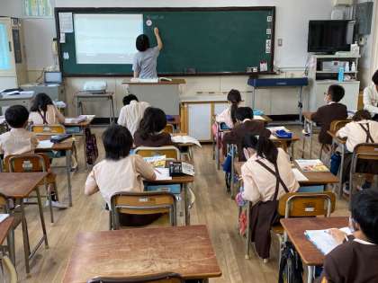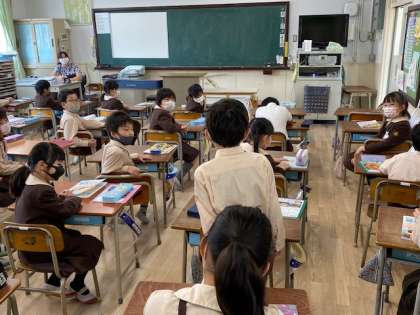 本日2時間目、2年生1・2組の授業のようすです。どちらも算数で、「かけ算」の九九の練習をしています。2組では一人ずつ六の段をみんなの前で発表しています。