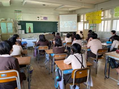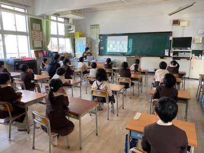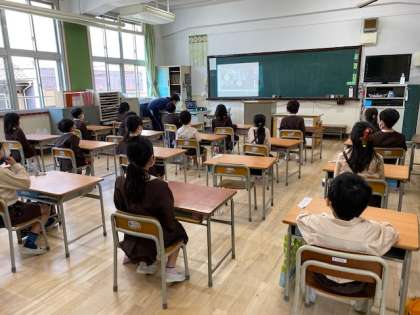 避難後、教室に戻りオンラインで職員室の校長先生の講話を各教室で聴きました。