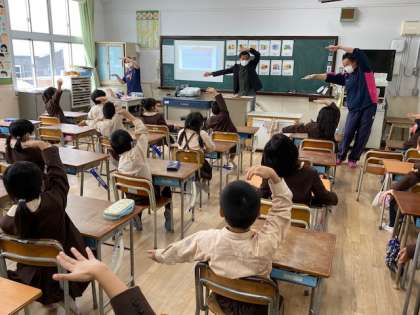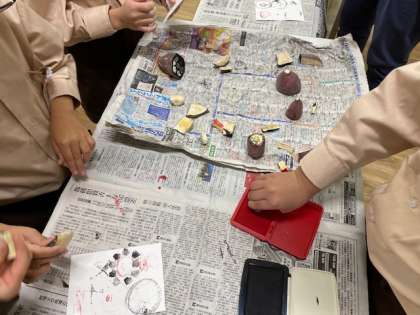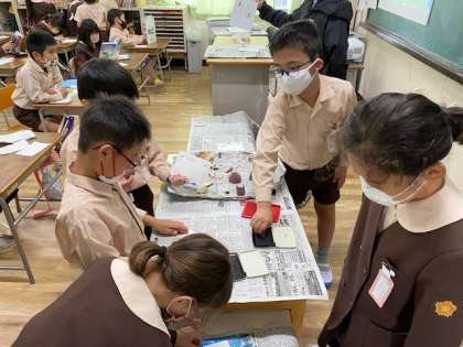 本日5時間目、2年生1・2組の授業のようすです。1組は生活科で、サツマイモで作ったハンコを押しています。2組はC-NETによる英語活動をしています。